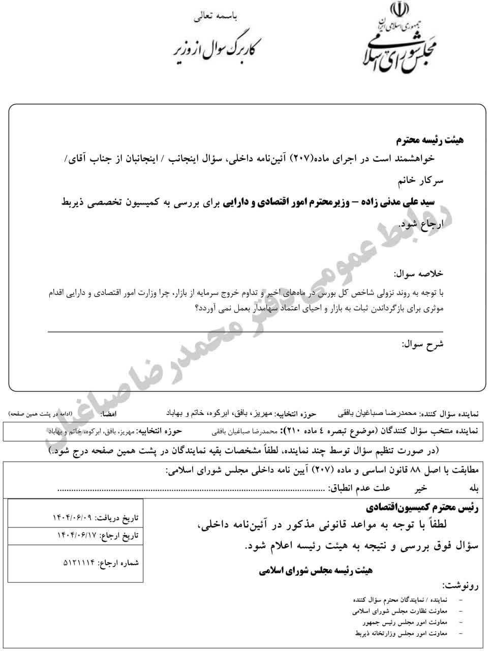 🔹 وی با تأکید بر نارضایتی گسترده میان سرمایهگذاران به دلیل بیثباتی بازار و ضعف در مدیریت مالی کشور، از وزیر امور اقتصادی و دارایی خواست توضیح دهد چرا تاکنون اقدامات اساسی و ملموسی برای بازگرداندن اعتماد عمومی و بهبود وضعیت بازار سرمایه انجام نشده است.