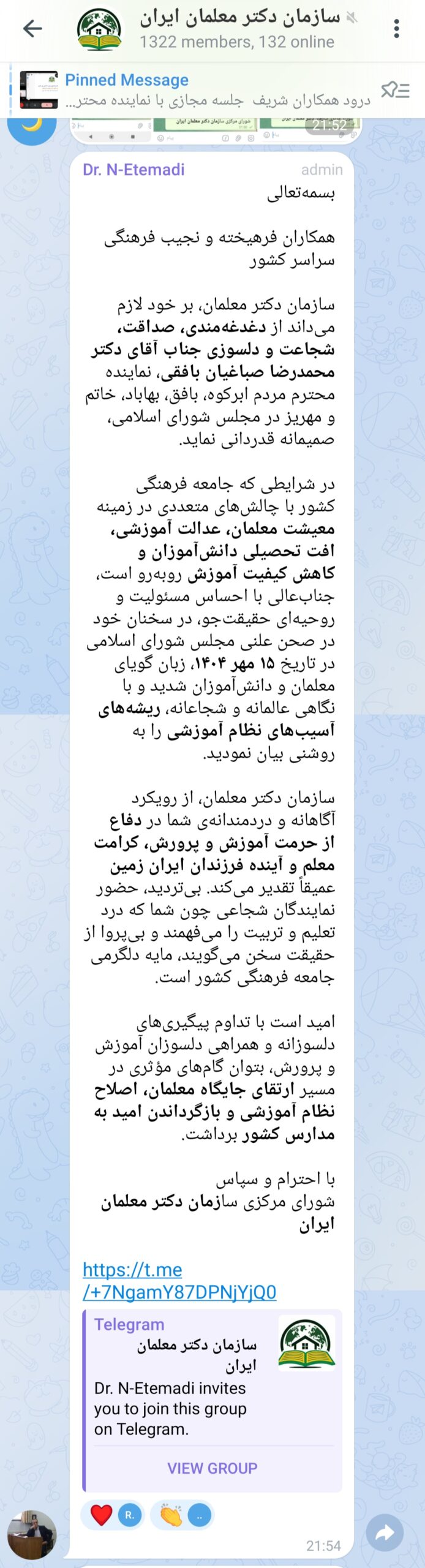 سازمان دکتر معلمان ایران با صدور بیانیهای از مواضع شجاعانه و دغدغهمندانهی محمدرضا صباغیان بافقی، نماینده مردم مهریز، ابرکوه، بافق، بهاباد، خاتم و مروست در مجلس شورای اسلامی، در دفاع از حقوق معلمان و اصلاح نظام آموزشی کشور تقدیر کرد.