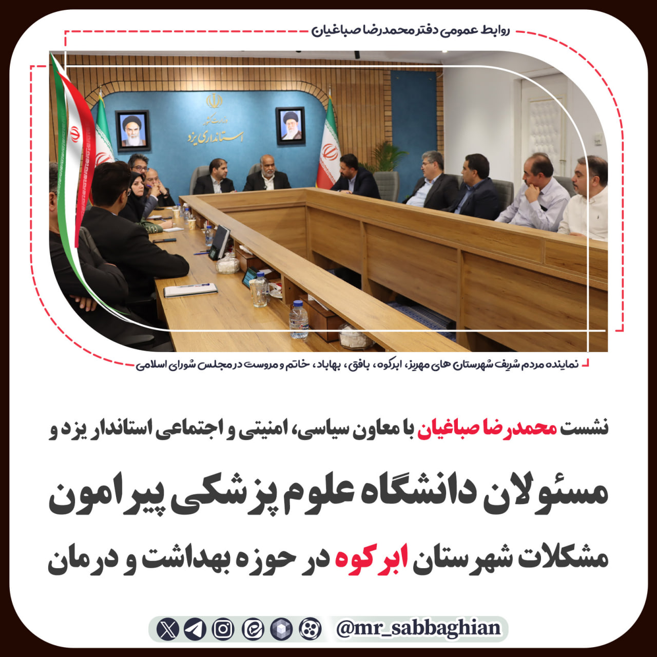 عصر روز سهشنبه 29 مهرماه 1404، نشست مشترکی با حضور محمدرضا صباغیان نماینده مردم حوزه انتخابیه مهریز در مجلس شورای اسلامی، معاون سیاسی، امنیتی و اجتماعی استاندار یزد، رئیس دانشگاه علوم پزشکی یزد، معاونان دانشگاه علوم پزشکی، رئیس اورژانس استان، معاون فرماندار شهرستان ابرکوه و جمعی از مدیران استانی و شهرستانی برگزار شد.