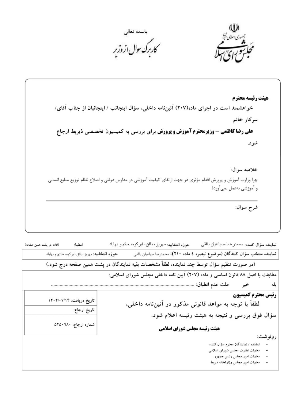 پیشتر نیز در همین زمینه مکاتباتی از سوی صباغیان نماینده حوزه انتخابیه مهریز انجام شده و سؤال وی از وزیر آموزش و پرورش در خصوص این موضوع بهصورت رسمی ثبت گردیده است و در حال پیگیری می باشد.