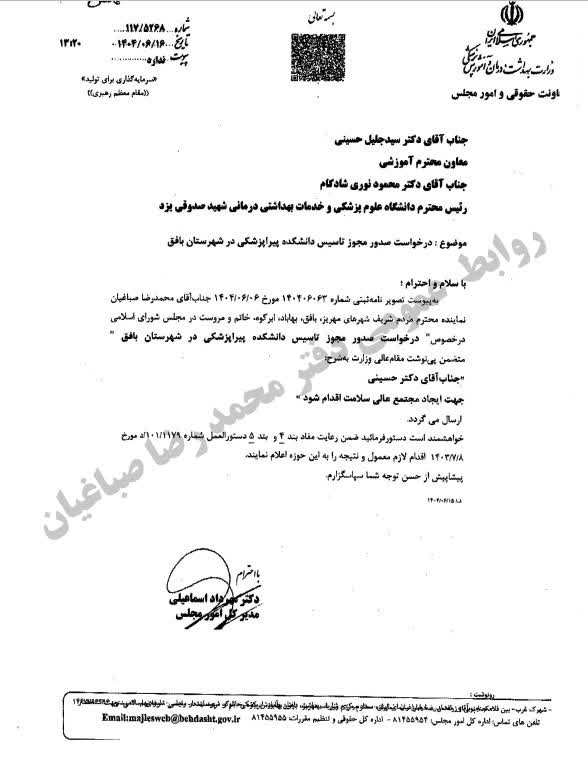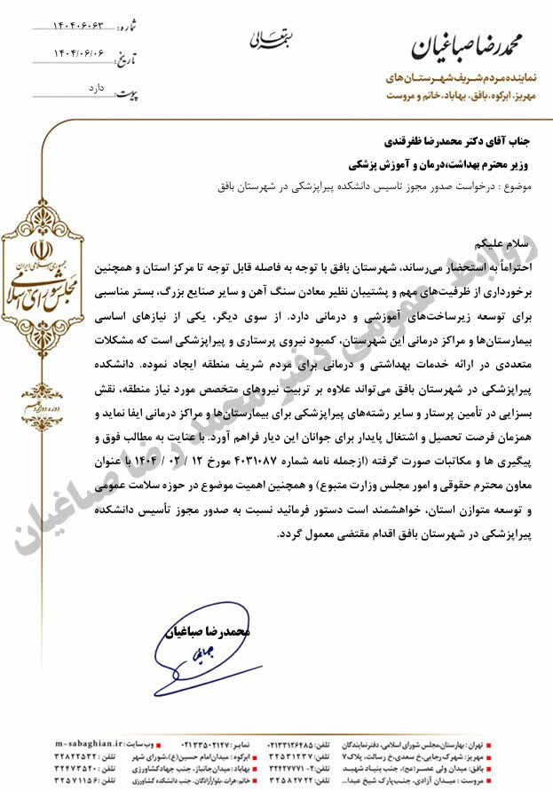 پیگیری محمد رضا صباغیان از طریق وزارت بهداشت درمان و آموزش پزشکی کشور در خصوص صدور مجوز تاسیس دانشکده پیراپزشکی در شهرستان بافق که لازمه عملی شدن آن پیگیری مسولان مربوطه در استان و شهرستان است