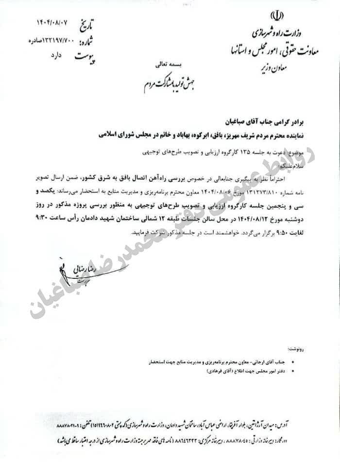 🔹 روز دوشنبه ۱۲ آبان ۱۴۰۴، محمدرضا صباغیان، نماینده مردم شهرستانهای مهریز، ابرکوه، بافق، بهاباد، خاتم و مروست در مجلس شورای اسلامی، با آقای رحمانی، معاون برنامهریزی و مدیریت منابع وزارت راه و شهرسازی و جمعی از مسئولان و کارشناسان حوزه حمل و نقل ریلی نشستی را برگزار کرد.