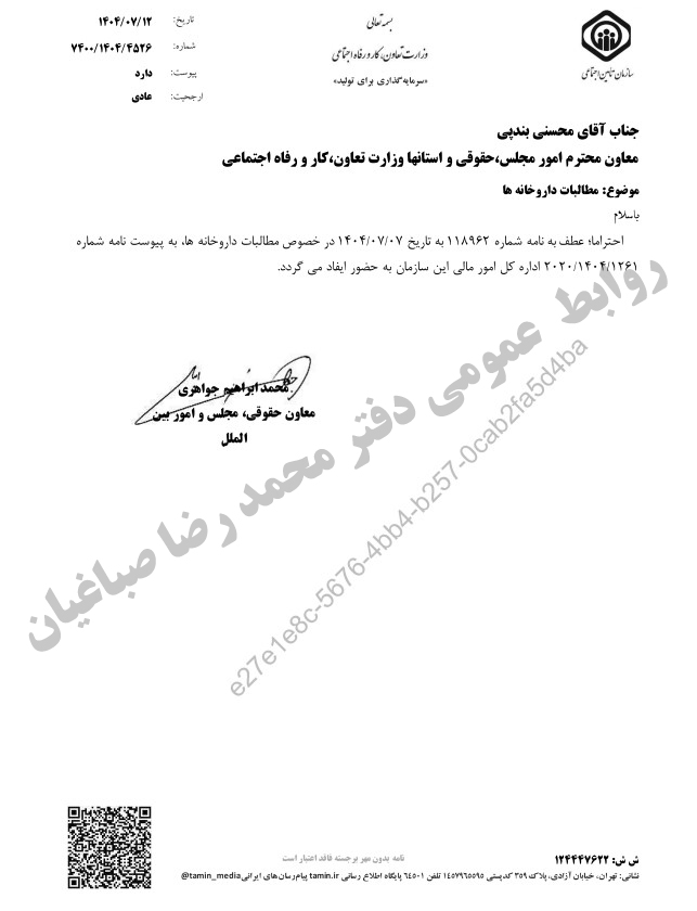 🚨پیگیری محمد رضا صباغیان در خصوص پرداخت مطالبات معوق مراکز درمانی طرف قرارداد تامین اجتماعی